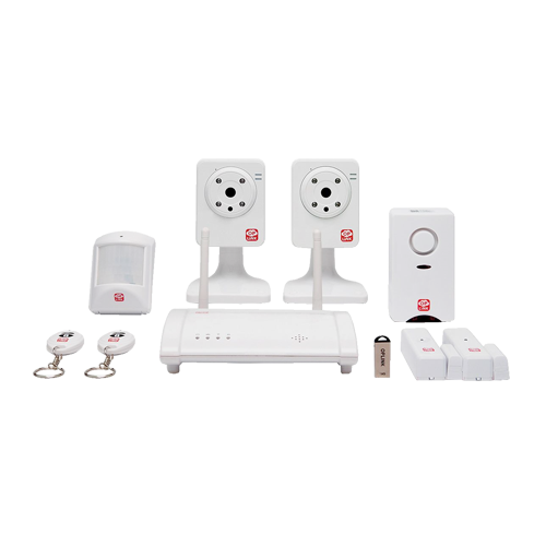 Il kit comprende la passerella di controllo, due telecamere IP con videosensore, un flash drive USB di memorizzazione dei video, due rilevatori di apertura porta / finestra, un rilevatore volumetrico PIR e una sirena e due telecomandi multifunzione. Inoltre, sono disponibili numerosi sensori e accessori per varie applicazioni pratiche, tra cui una presa domotica, che possono essere aggiunti al sistema di allarme semplicemente mediante la scansione del codice QR dalla app smartphone.