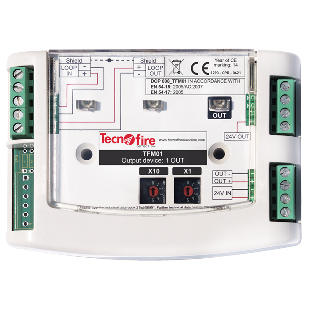 Módulo direccionable 1 salida - 2 modalidades de tipo salida: contacto o OC - 2 criterios de funcionamiento: silenciable y no - Entrada de servicio protegida - 1 testigo de señalización estado salida - Fijación superficial o DIN con accesorio(TFDIN)