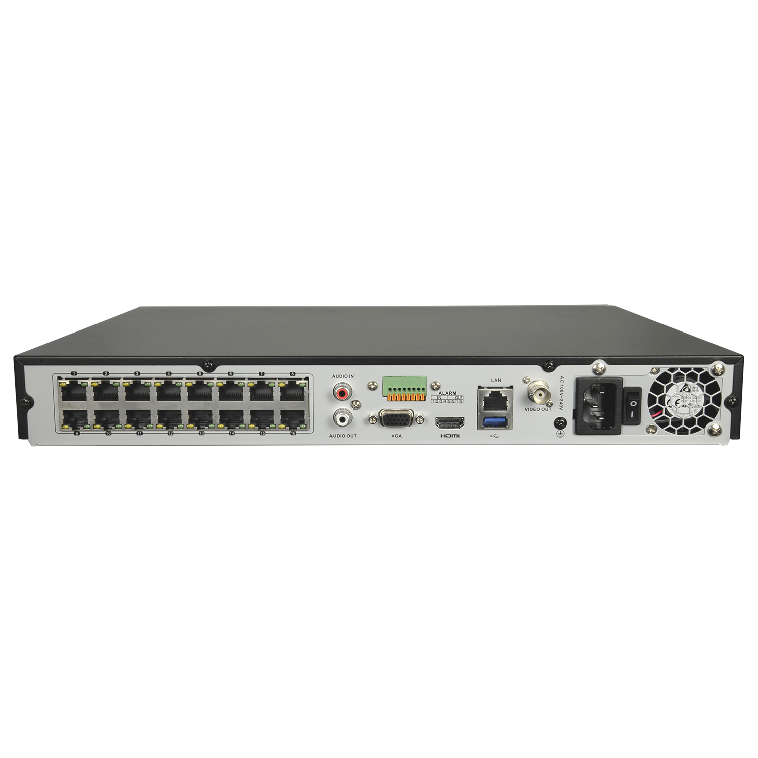 NVR para cámaras IP - 16 CH vídeo / 16 puertos PoE - Resolución máxima 8.0 Mpx / Compresión H.265+ - Ancho de banda 160 Mbps - Salida HDMI 4K y VGA - Permite 2 discos duros
