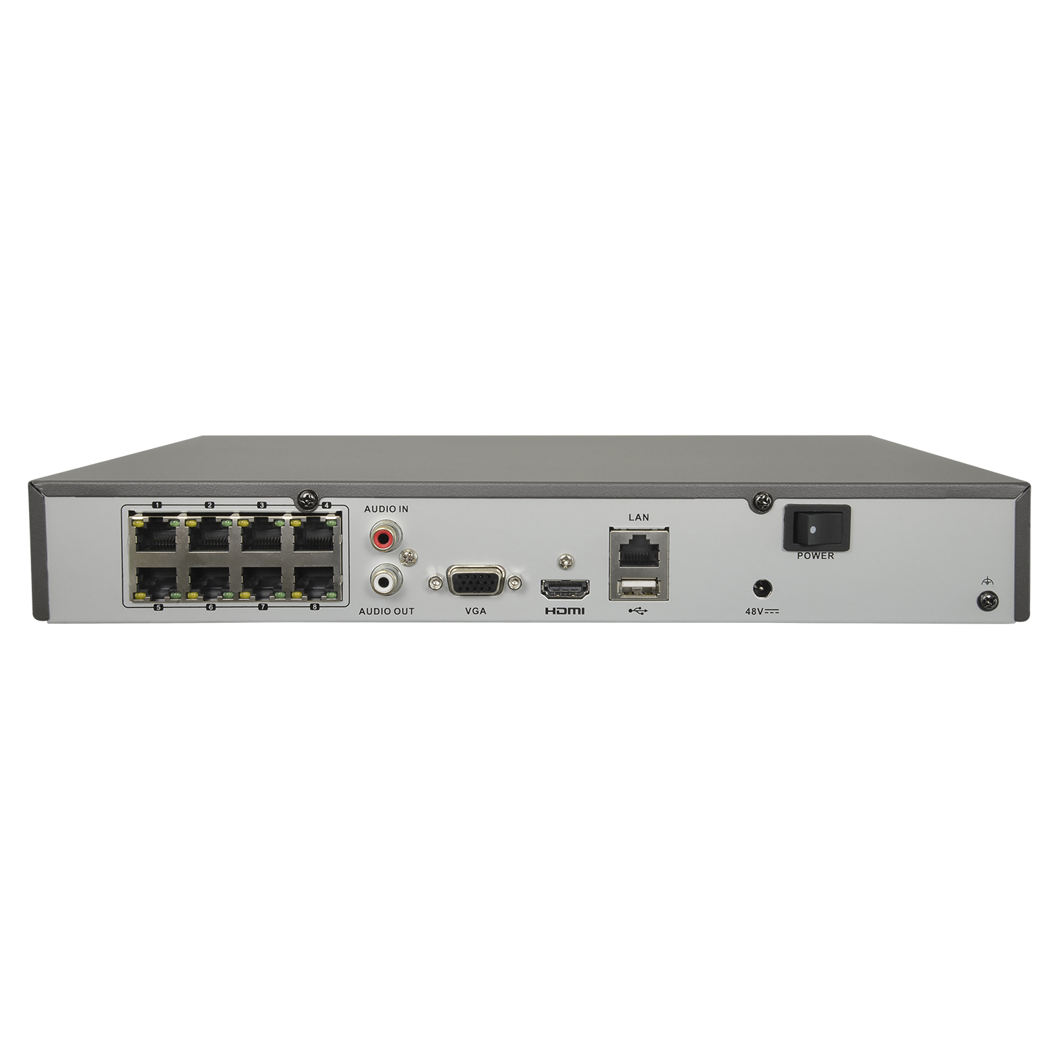 NVR para cámaras IP - 8 CH vídeo / compresión H.265+ - 8 canales PoE - Resolución máxima 8Mpx - Ancho de banda 80 Mbps - Salida HDMI 4K y VGA - Permite 1 disco duro