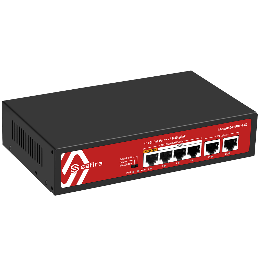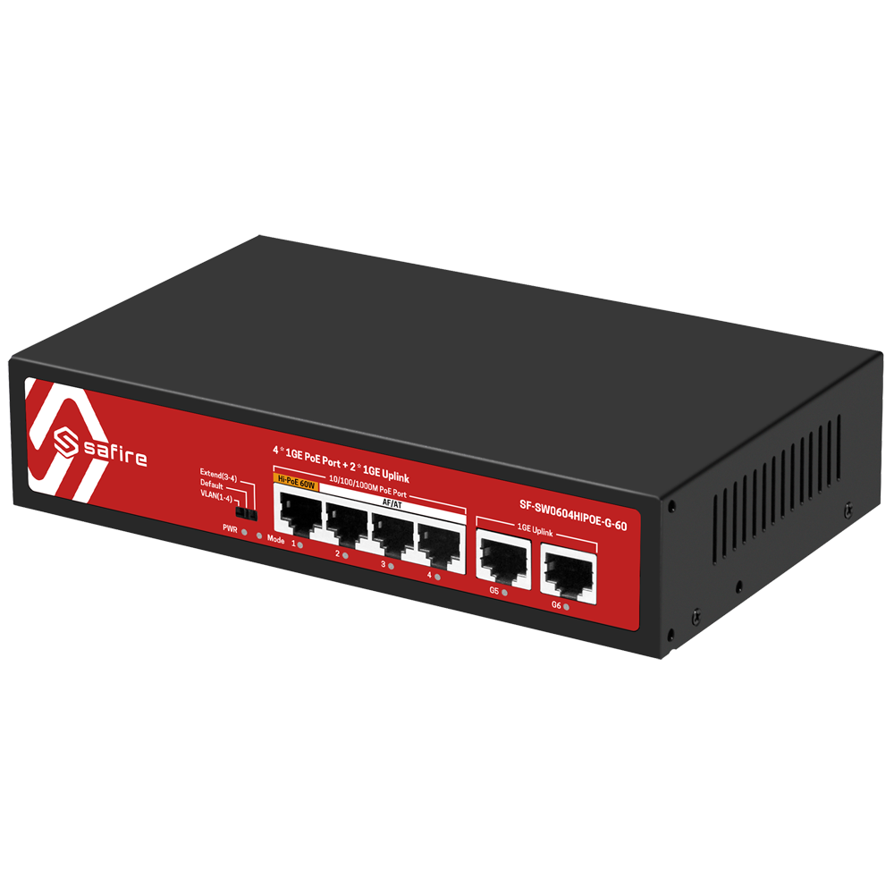 Safire Switch PoE - 4 puertos PoE + 2 Uplink RJ45 - Velocidad de puertos 10/100/1000 Mbps - 4 Puertos PoE+ 30W - Potencia PoE total de 60W - PoE Watchdog / Auto PoE Extendido Hasta 250m