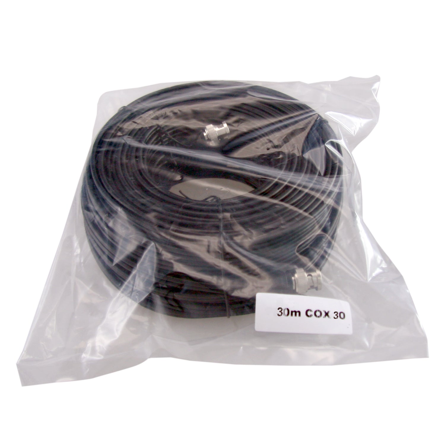 Estensione del cavo coassiale SAFIRE per segnali video e di potenza. Cavo combinato RG59 + DC. Poche perdite. Lunghezza fissa 30 metri, con connettore maschio video BNC alle estremità.