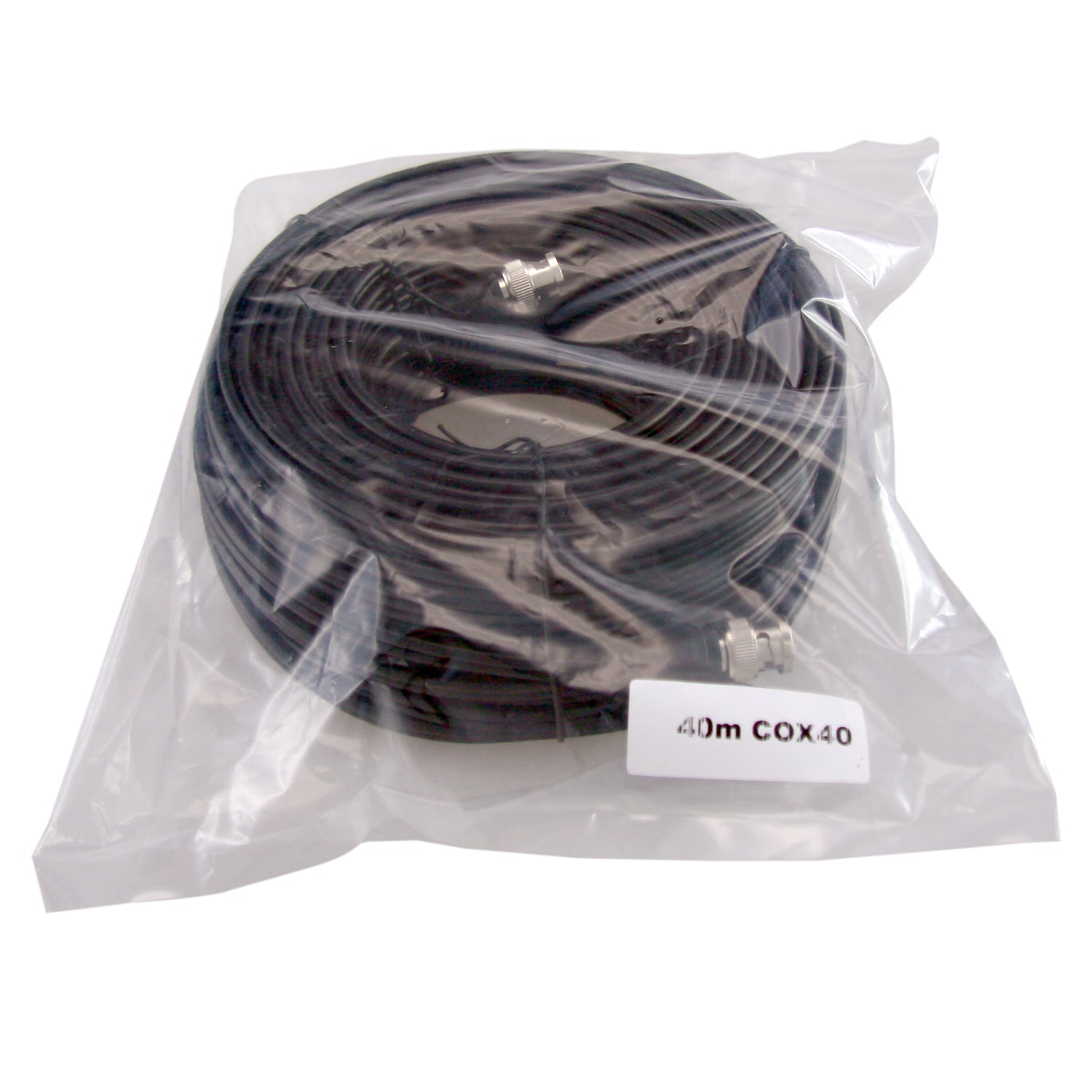 Estensione del cavo coassiale SAFIRE per segnali video e di potenza. Cavo combinato RG59 + DC. Poche perdite. Lunghezza fissa 40 metri, con connettore maschio video BNC alle estremità.