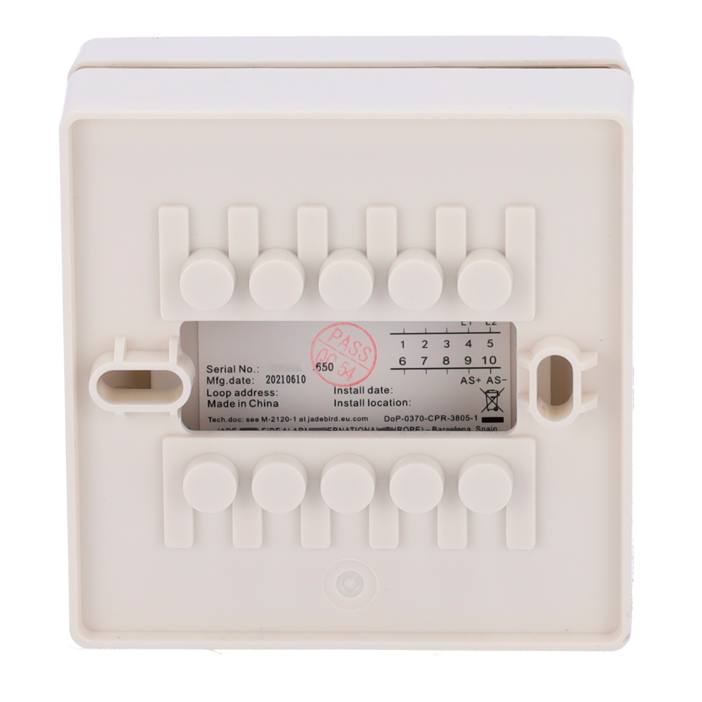 Progettato per il funzionamento in loop - Alimentazione tramite loop - Modulo di ingresso logico - Base con terminali per una facile rimozione/installazione JBE-2175 - Indirizzo programmabile tramite il modulo JBE-AT1 - rfl di 10 kΩ (fornita) -