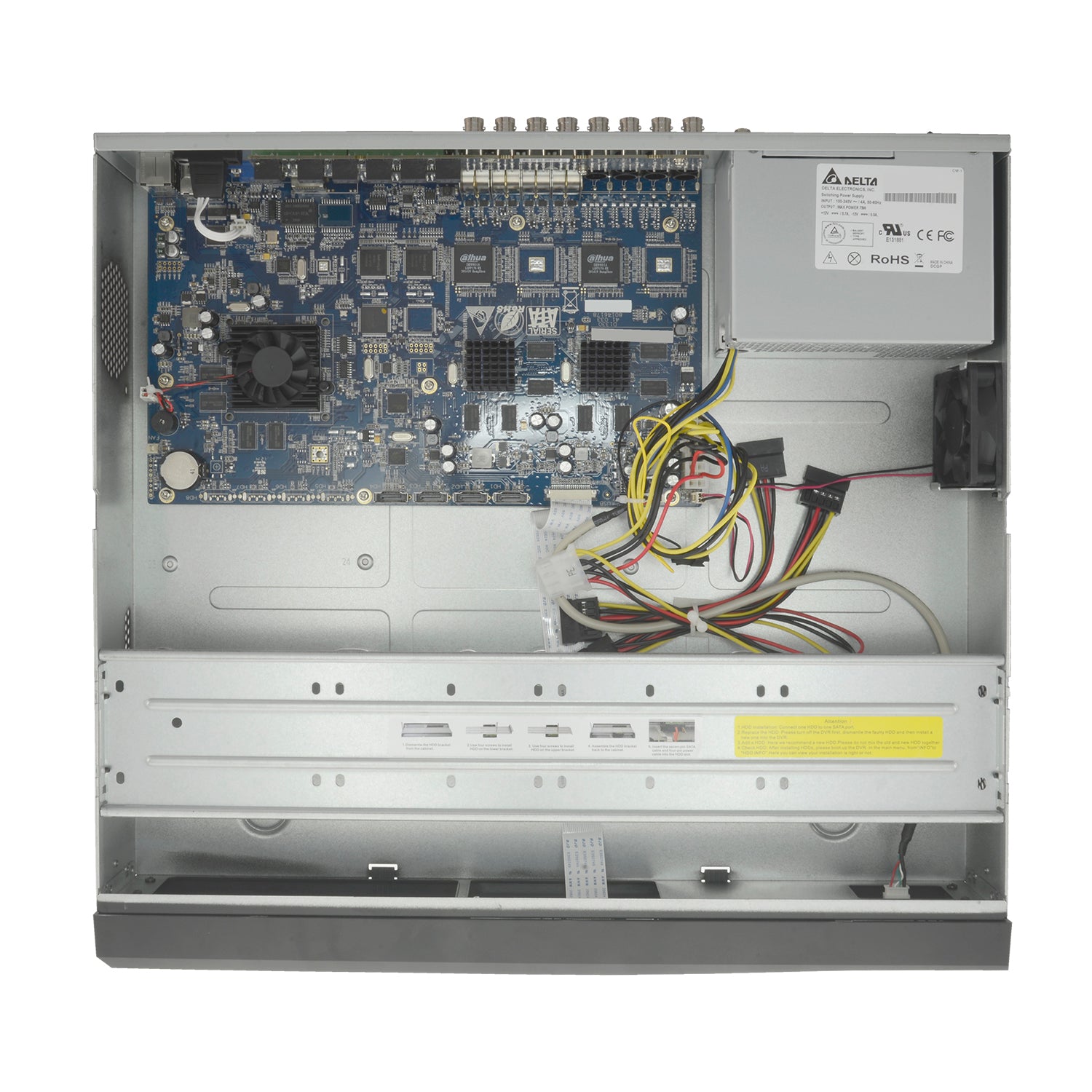 consente l'utilizzo di tre tecnologie nello stesso canale: HDCVI, analogico video CVBS composito o flusso video da una telecamera IP. Dispone di 8 ingressi video con connessione BNC e 4 ingressi audio con connessione BNC. Ha disponibili 1 uscite audio BNC e 4 uscite video: una uscita video composta BNC, un'uscita VGA e un'uscita Full HD HDMI tutto simultanea, insieme ad un'uscita Full HD HDMI aggiuntivo indipendente. Sistema operativo Linux incorporato, con multitasking pentaplex che permette: visualizzazione dal vivo, registrazione, riproduzione, backup e accesso remoto contemporaneamente.