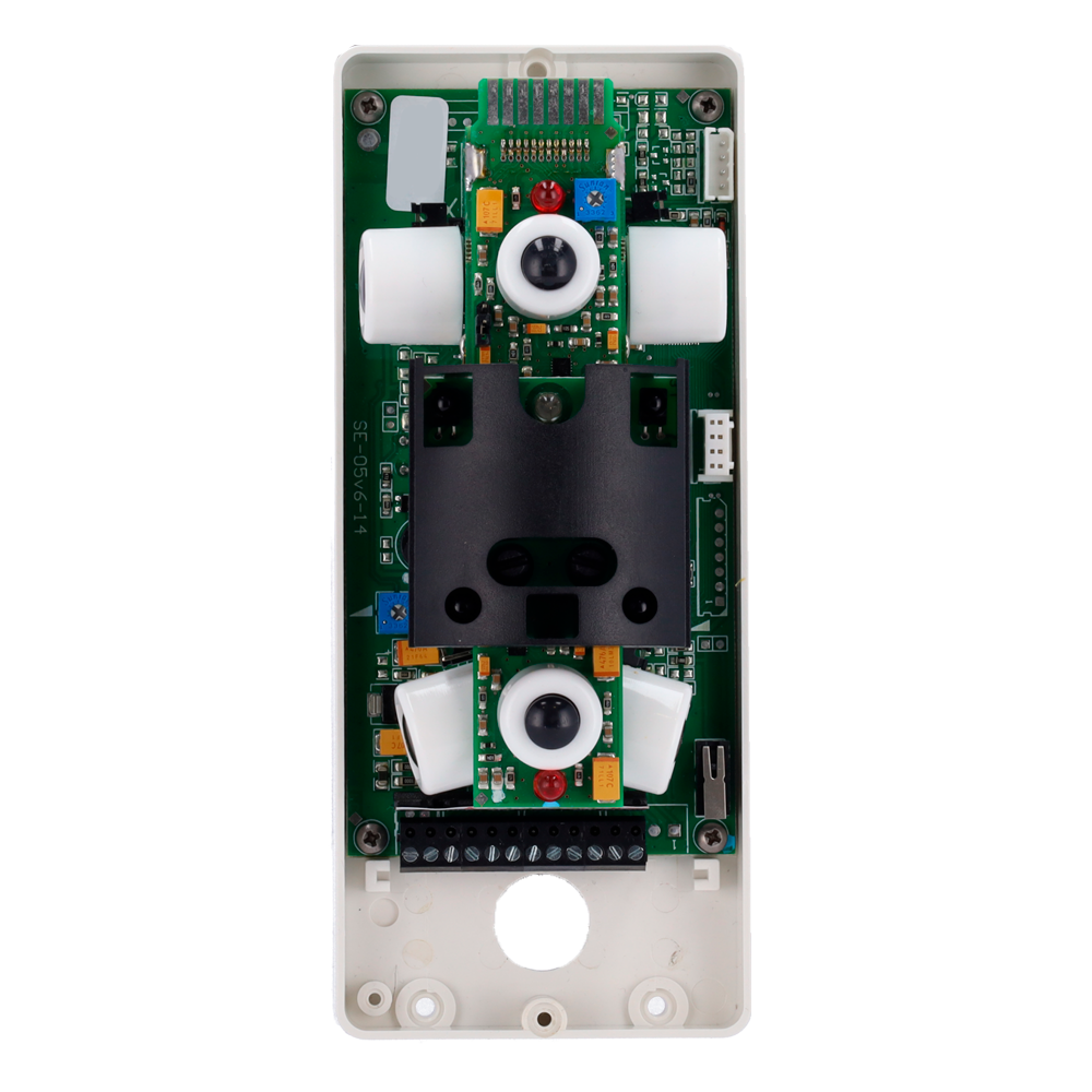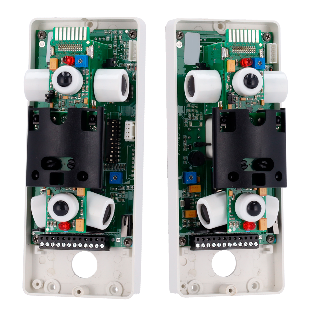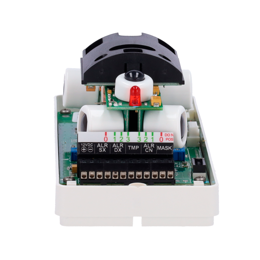 Rilevatore da esterno cablato Duevi - Doppio PIR su ciascun lato e doppio PIR frontale - Copertura totale 180º / Antimasking - Alimentazione 9.6 ~ 14.5 VDC - Compatibile con i sistemi di allarme cablati - Uso esterno IP54 / Antivandalo IK10