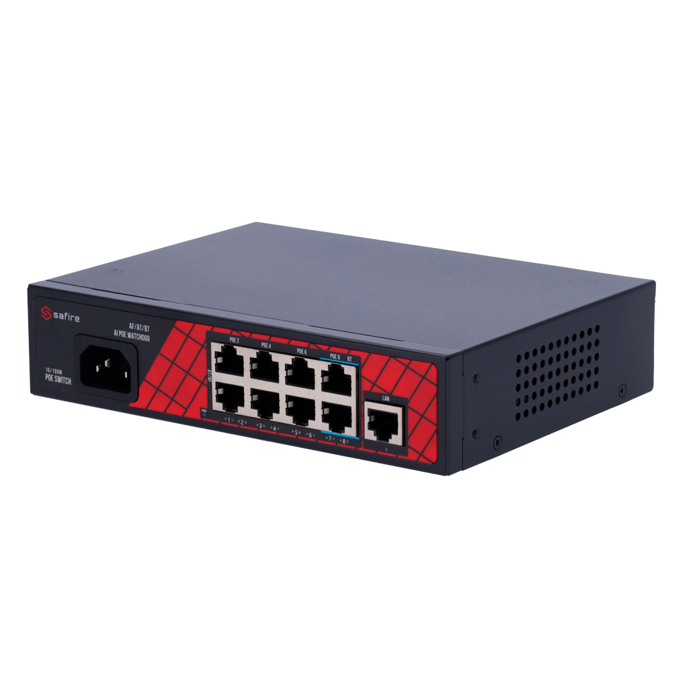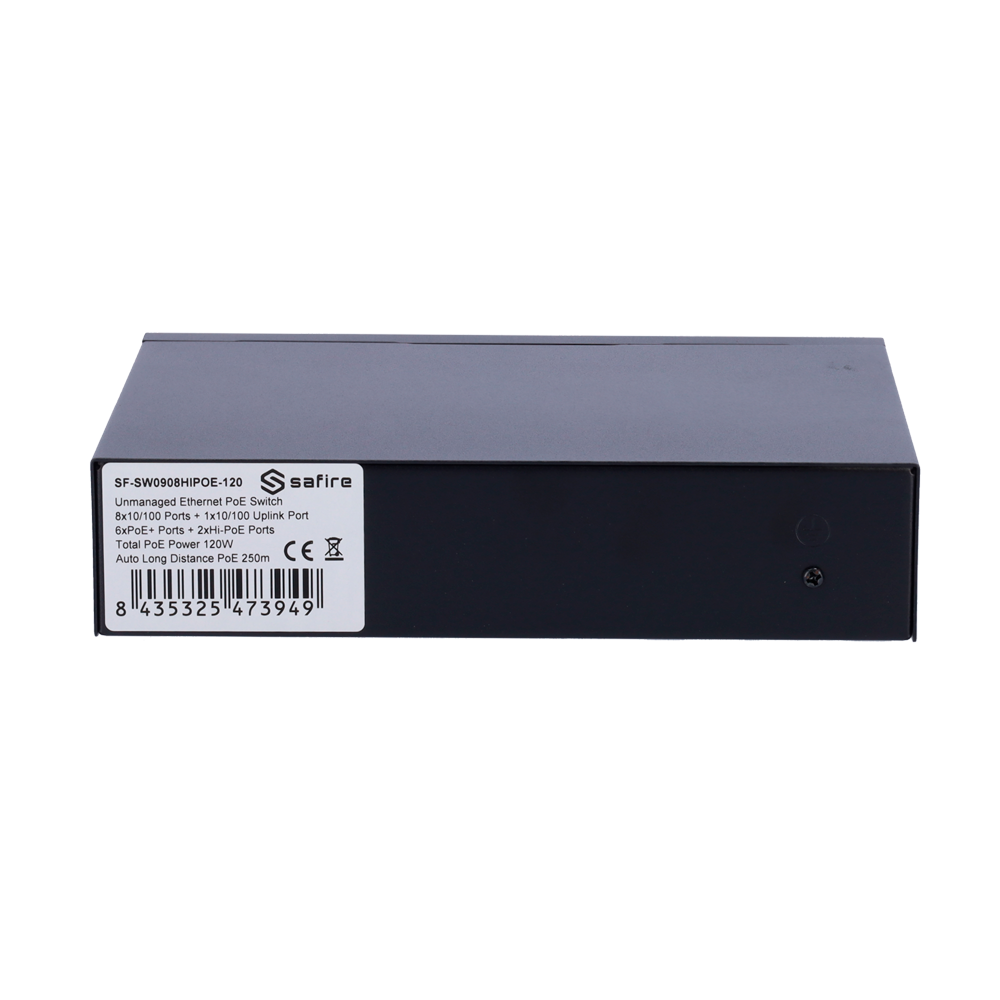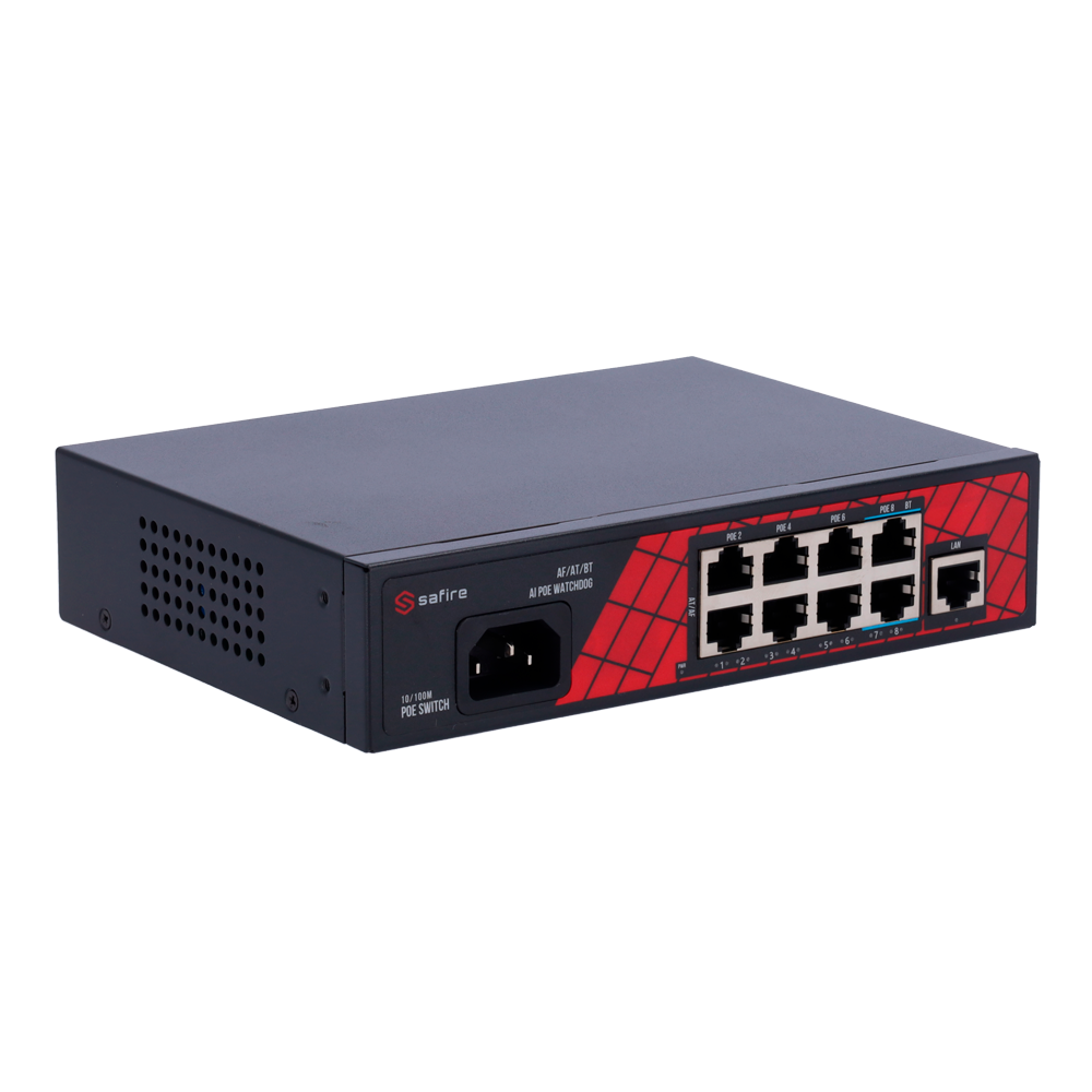 Safire Switch Hi-PoE - 8 puertos PoE + 1 Uplink RJ45 - Velocidad de puertos 10/100Mbps - 6 Puertos PoE+ 30W + 2 Puertos Hi-PoE 60W - Potencia PoE total de 120W - PoE Watchdog / Auto PoE Extendido Hasta 250m