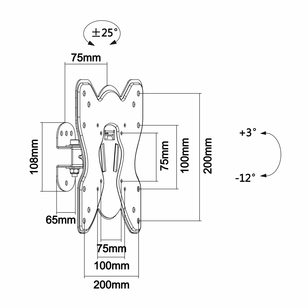 Supporto a parete per monitor LCD - Inclinazione -12º~ 3º - Rotazione -25º~ 25º - Muro di separazione 75 mm - Resistenza al carico 25 Kg - Schermi 23"~42"