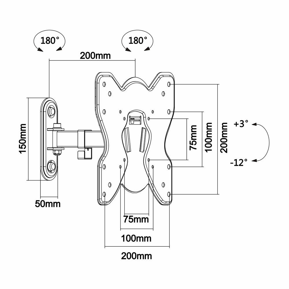 Supporto a parete per monitor LCD - Inclinazione -12º~ 3º - Rotazione -90º~ 90º - Muro di separazione 65~200 mm - Resistenza al carico 25 Kg - Schermi 23"~42"